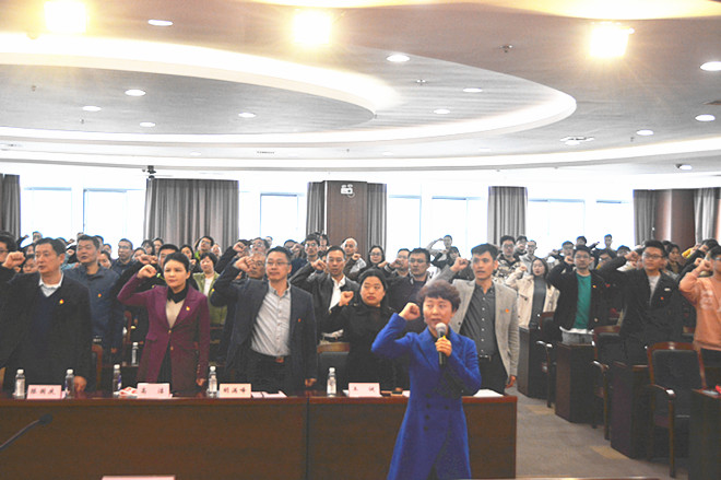 悠扬的校歌声中,新党员入党仪式正式开始。55名新党员依次走到台前,由教师党员为他们佩戴党员徽章。一枚枚小小的党徽,不仅承载着党员教师对学生成长成才的殷切希望,也象征着共产党人坚定信念、初心使命的继承与发扬。之后,会场所有党员一齐起立,举起右手,面对党旗进行了庄严宣誓。
