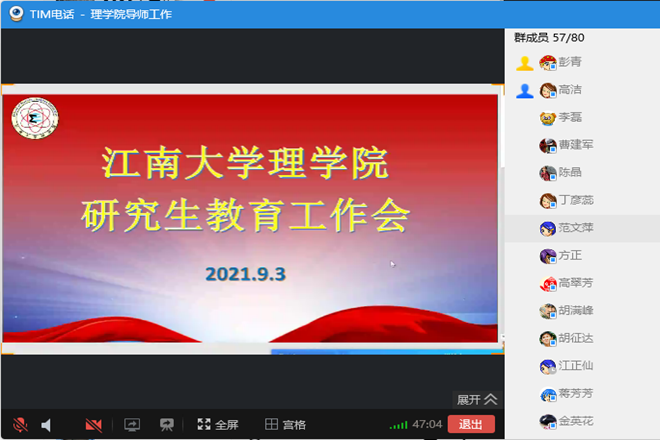 为认真落实江南大学研究生教育工作的重要指示,结合关于新型冠状病毒感染的肺炎疫情防控相关文件要求,减少疫情对研究生教学秩序的影响,学院于9月3日召开了理学院研究生教育工作线上视频会议。学院全体导师、研究生教学工作小组成员及研究生任课教师参加了此次会议。会议由副院长高洁主持。
