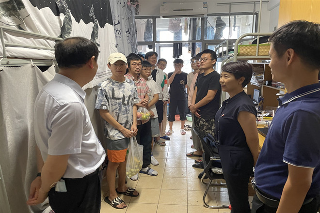 走访过程中,王珏和陈国庆亲切询问大家是否适应留校生活,有没有遇到什么困难,如若遇到学习或者生活上的困难,可以随时向学院、班主任、辅导员老师们反馈,学院一定会想方设法予以解决。对于院领导们的亲切慰问与关心,同学们感到非常的暖心与开心,表示虽是疫情期间留校,但在学校与院系的支持与关心下,暑期学习与生活很顺利,并表态一定会带着学校和学院的关爱和温暖,坚决支持学校的工作,做好自我管理,保质保量的投入到学习中。