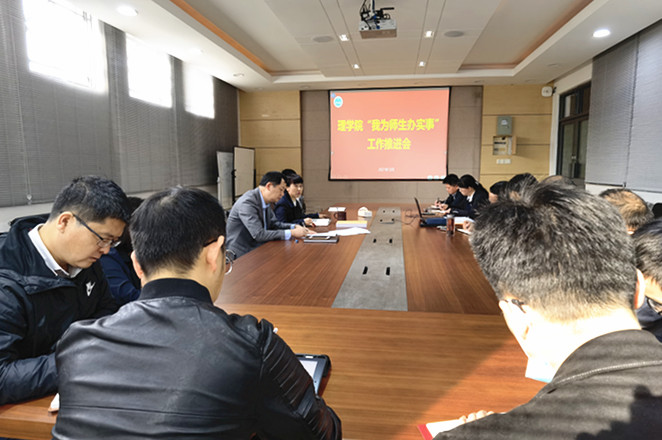 10月19日上午,理学院于201会议室召开“我为师生办实事”工作推进会,理学院党委书记王珏,院长陈国庆,院副书记、副院长陈周,全体党支部书记、系主任参加会议。会议由党委书记王珏主持。