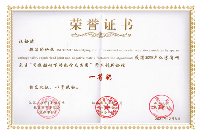 我院高洁教授指导的汪钰洁同学参选的论文《SOJNMF: Identifying multidimensional molecular regulatory modules by sparse orthogonality-regularized joint non-negative matrix factorization algorithm》提出了一种新颖的SOJNMF算法,在联合非负矩阵分解的基础上可以有效控制分解后矩阵的稀疏性,同时能显著降低识别到的多维调控模块之间特征的重叠率,荣获本次学术创新论坛一等奖,该文已发表在计算生物学与生物信息学领域颇有影响力的IEEE/ACM Transactions on Computational Biology and Bioinformatics期刊上;程浩老师指导的柳冕同学参选的论文《一类非线性时间分数阶扩散方程反问题的变分型正则化》,介绍了非线性时间分数阶扩散方程反问题的相关研究情况,荣获此次学术创新论坛二等奖。