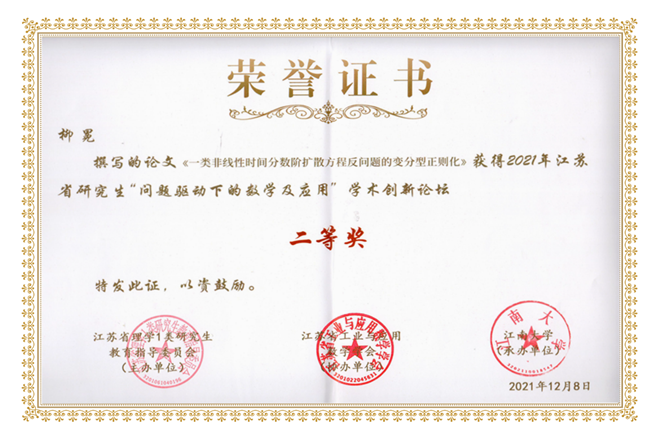 近日,2021年江苏省研究生“问题驱动下的数学及应用”学术创新论坛在江南大学圆满落幕。经江苏高校数学学科联盟组织专家严格匿名评审,论坛在120篇投稿论文中录取口头报告论文48篇,墙报展示论文13篇。由江苏高校数学学科联盟组织专家对交流论文进行点评和打分,最终评选出论坛一等奖论文6篇,二等奖论文9篇,三等奖论文11篇,优秀墙报奖论文3篇。我校13位同学踊跃投稿,理学院数学专业研究生汪钰洁、柳冕、沈紫园同学的论文脱颖而出,录用为论坛口头报告,沈俊强同学的论文为墙报展示。最终经激烈角逐,汪钰洁同学的论文荣获一等奖,柳冕同学的论文荣获二等奖。