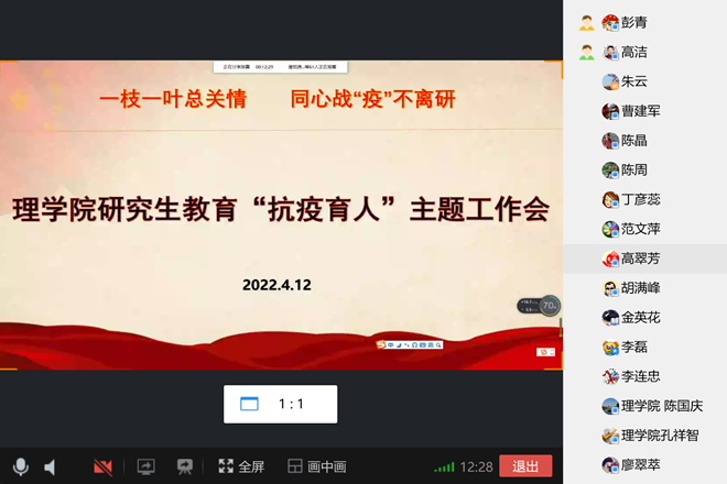 为进一步切实发挥好“研究生培养第一责任人”的作用,有序推进学校疫情防控和研究生教育工作,主动扛起研究生教育责任大旗,坚决贯彻学校党委统一部署,牢固树立共同抗疫意识,细化工作责任,落实工作实效,确保疫情期间我院研究生教育管理工作平稳有序开展,理学院于4月12日下午召开全体导师线上会议,会议由副院长高洁主持。