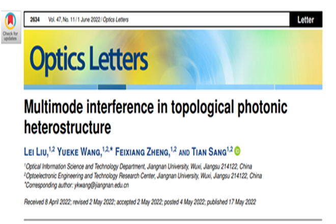 近日,理学院光电信息科学与工程专业1902班本科生刘磊以第一作者身份在光学类top期刊《Optics Letters》(中科院二区,影响因子:3.776)发表题为“Multimode interference in topological photonic heterostructure”的高水平学术论文。该论文是我校2020年校级大学生创新创业训练计划项目的研究成果,指导教师是王跃科副教授。此外,刘磊同学在该项目支持下的另外一项工作也被应用物理类期刊《Journal of Physics D: Applied Physics》(中科院三区,影响因子:3.207)接收。