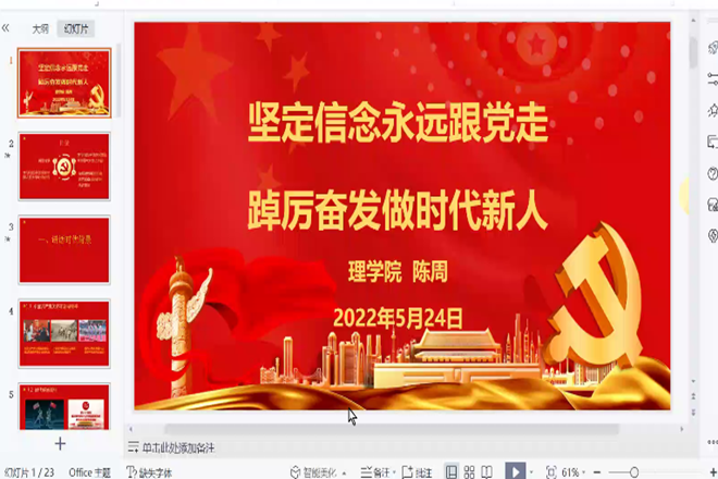 最后,陈周以“坚定信念永远跟党走,踔厉奋发做时代新人”为题进行第一讲,从新青年自强发展的时代背景、学习习近平总书记在视察中国人民大学的讲话、习近平总书记在庆祝中国共产主义青年团成立100周年大会上的讲话精神几个方面展开,希望同学们做有理想、敢担当、能吃苦、肯奋斗的新时代好青年。同时,结合疫情特殊时期,强调了遵守疫情防控规章制度的重要性,激励大家从身边能做的小事做起,将小我的理想与国家发展结合起来。