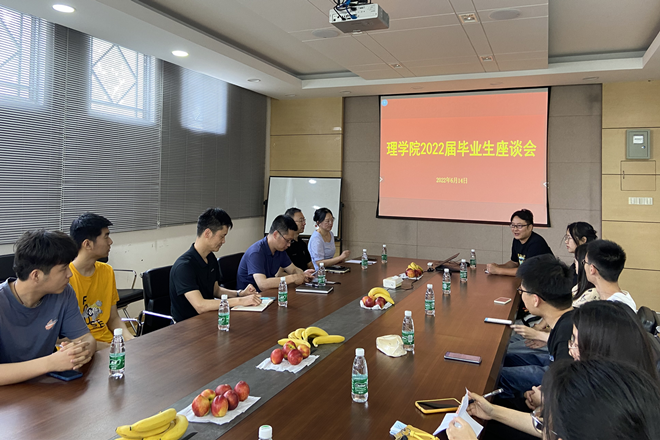 6月14日下午,理学院在201会议室举行2022届本科毕业生代表座谈会。理学院副书记、副院长陈周,副院长胡满峰,光电系主任席曦,信计系主任过榴晓以及2022届本科毕业生代表参加座谈会。会议由毕业班辅导员曹磊主持。