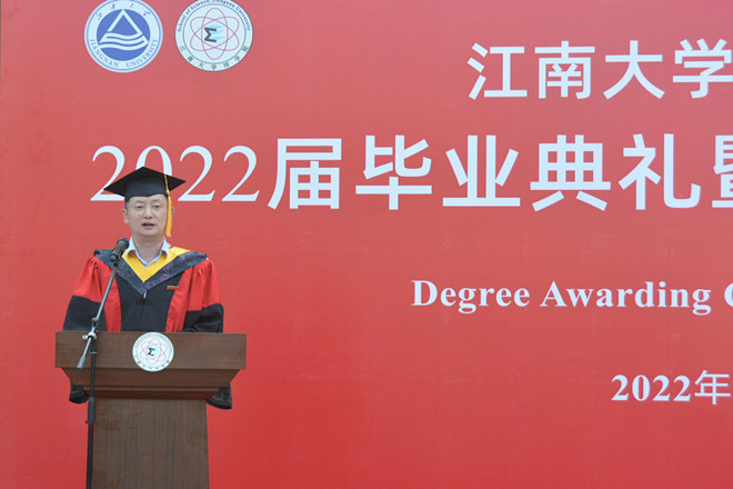 典礼在雄壮的国歌声中拉开序幕。随后,陈国庆致辞。他首先代表学院全体师生对2022届毕业生表示热烈的祝贺和衷心的祝福。他回顾了同学们在校园学习、生活的点滴以及在科研、竞赛等方面取得的众多优异成绩,指出正是同学们的一次次努力于突破,构成了最具诗意、最有激情的青春年华。临别之际,他希望同学们坚持奋斗,坚定理想信念,练就过硬本领,奋进争优创先,努力交出一份不负时代、不负韶华的“青春答卷;坚定责任,肩负使命,努力成为一名大美中国的建设者、美好生活的奉献者、和美家庭的承担者;坚守情怀,不忘初心,怀揣家国情怀,争做具有大格局、大智慧、大视野的时代新人。最后,他祝福全体毕业生用数理智慧,创造人生幸福的无穷开区间。