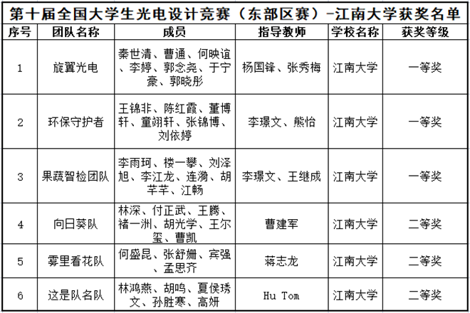 近日,第十届全国大学生光电设计竞赛(东部区赛)获奖名单公布,江南大学理学院3支队伍斩获一等奖并晋级国赛,3支队伍取得二等奖,此次入围国赛的队伍和获奖数量均创新高。