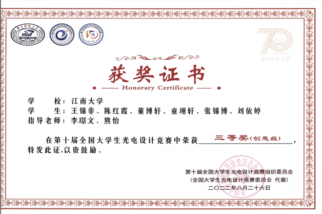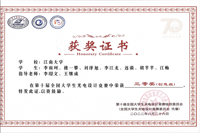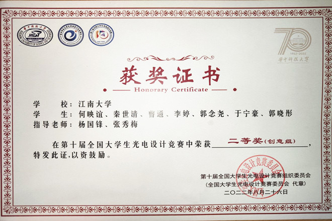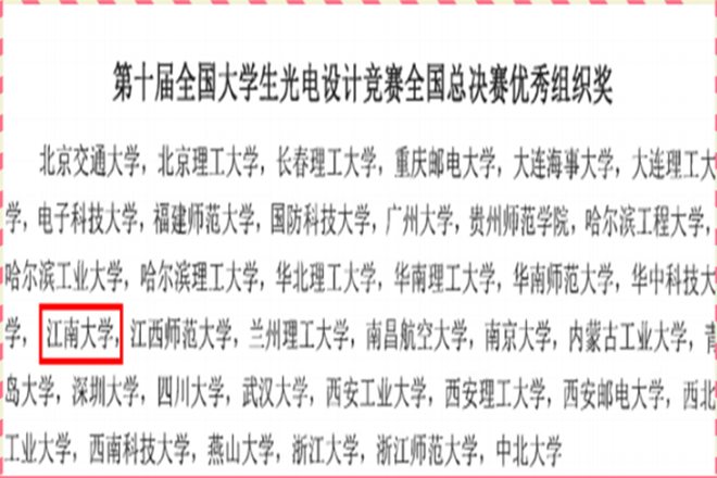 近日,第十届全国大学生光电设计竞赛获奖名单公布。前期经过华北、东北、西北、西南、中部、东南和东部七个分赛区选拔,最终有来自154所高校的337个支参赛队、2538名师生进入全国总决赛。江南大学共3支队伍参赛,斩获1个二等奖、2个三等奖,江南大学荣获第十届全国大学生光电设计竞赛全国总决赛“优秀组织奖”。