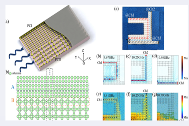 利用光子晶体拓扑特性可以设计各种光学器件来操控电磁波的传播,是目前的热门研究领域。该课题利用经典的四圆柱拓扑结构,创新的提出梯度排列方式,成功实现了梯度频率变化的光传输拓扑边界态通道。对于初始结构旋转参数δ = 0和最后结构旋转参数δ = 0.5,实现了两者由于π的Zak相位而产生的拓扑边界光传输。利用Γ-M-X-Γ的路径,分析了各个单元的能带情况,并对其中空出的带隙定义为拓扑平庸和拓扑非平庸态。对其中各个点的场分布进行了对称性的奇偶分析,巧妙的对带隙上下发生拓扑变化的结构进行组合,从而产生效果极好的拓扑光传输。此外,设计了更为集成优良的波分复用器,按照组合的形式进行了多通道传输模拟,理论上可以调控任意频率的光传输。并利用实验成功的验证了该设计方案的可行性,成功实现了9.34、9.66、10.12和10.94 GHz等通道的传输。上述研究工作为拓扑光通信、光子集成线路等领域带来了新的应用途径。