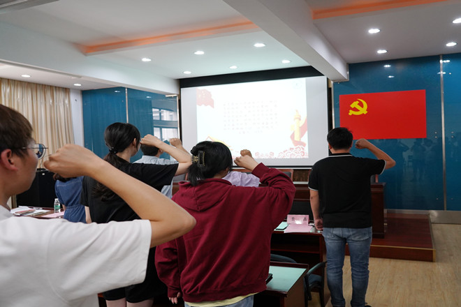 入党宣誓仪式在庄严的国际歌中正式拉开序幕。许金红宣读新发展党员名单;由曹磊领誓,所有新党员高举右拳庄严宣誓。胡安琪作为预备党员代表发言,表示要努力向优秀党员同志们学习看齐,争取早日成为合格正式党员,愿意在实践中接受党组织的考验,以青春之志共筑祖国美好未来。