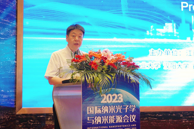 江南大学党委常委、副校长倪松涛致欢迎辞,他代表江南大学向全体来宾表示热烈的欢迎。他首先介绍了江南大学和学院的发展情况。他指出,本次会议规模盛大,来自全国众多知名大学、研究所等单位专家学者齐聚太湖明珠无锡,通过与会人员充分的交流与共享,本次大会定能收获令人满意的成果,也定会推动纳米光子学及能源学科实现更快的发展、攀登下一个高峰。他希望通过此次会议,让更多的朋友认识无锡,认识江南大学,并祝愿全体参会人员能在此次会议中博采学术、增进交流、开拓视野、收获友谊。