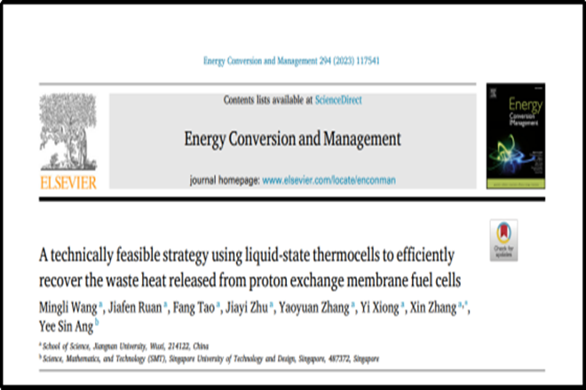 近日,理学院光电信息科学与工程系21级本科生省级重点大创团队(队长:王明礼;队员:阮家芬、陶芳、朱珈熠、张耀元;指导老师:张欣、熊怡)在低温燃料电池的废热回收利用与热电联产方面取得重要研究进展,研究成果以题为“A technically feasible strategy using liquid-state thermocells to efficiently recover the waste heat released from proton exchange membrane fuel cells”发表在热力学与能源利用领域顶级期刊《Energy Conversion and Management》(中科院一区Top期刊,影响因子:10.4)。光科2102班本科生王明礼为论文的第一作者,理学院张欣副教授为论文的唯一通讯作者。该项工作的合作者为Singapore University of Technology and Design的Yee Sin Ang副教授。该研究工作得到了江苏省自然科学青年基金项目的资助。