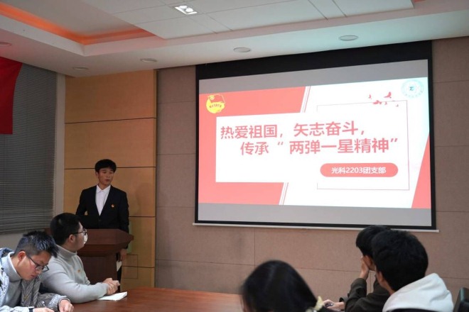 堵国成作总结点评讲话,对本次主题团日活动给予了充分肯定。他强调,“两弹一星”精神背后浓缩了我国科技工作者艰苦卓绝的奋斗历程,凝结了老一辈科学家的爱国之志,是我国国防科技不断发展的生动见证。他向同学们提出了三点希望:一是传承革命精神,厚植家国情怀。要大力弘扬包括“两弹一星”精神在内的革命精神,以对党和国家高度负责的担当精神,立志做有理想、敢担当、能吃苦、肯奋斗的新时代好青年。二是力促知行合一,确保行稳致远。既要仰望星空,又要脚踏实地,把人生理想和社会需要结合起来,在国家发展和民族复兴中实现人生的价值。三是立志科技强国,担当时代重任。认真学习专业知识,结合自身专业特色,不断在专业领域中开拓创新,为实现科技自立自强作出贡献。
