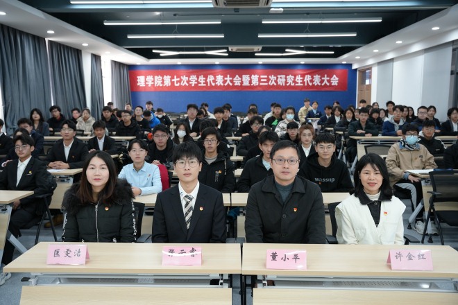 12月17日上午,理学院第七次学生代表大会暨第三次研究生代表大会在理学院215召开,院党委副书记、副院长董小平,学工办主任兼分团委书记许金红,辅导员兼学生会指导老师匡雯洁,物联网工程学院研究生会主席团成员张云睿以及学研代表共计79人参加大会。大会由院学生会主席团成员胡凌峰主持。
