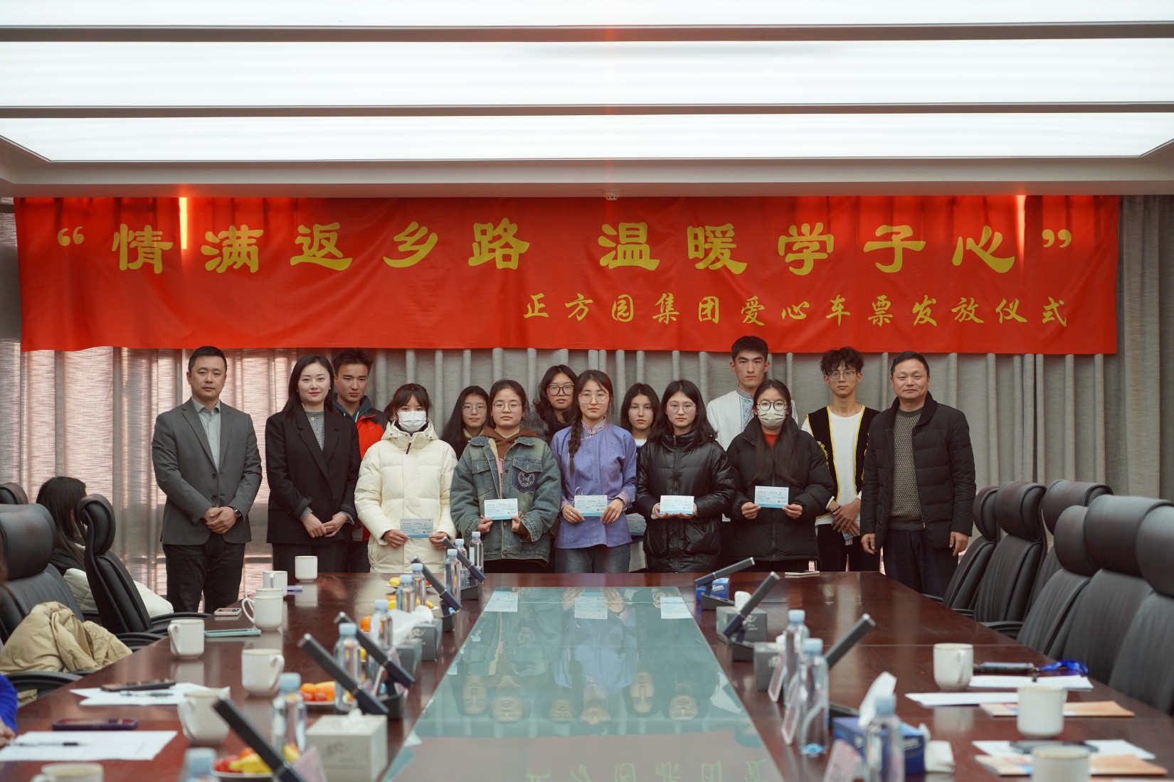王明生、王珏共同将价值1000元的爱心车票送到贫困生手上,每一张车票都饱含正方园集团对学子的关爱与厚望,让少数民族的同学们在寒冷三九天里伴着温暖与爱顺利回家。