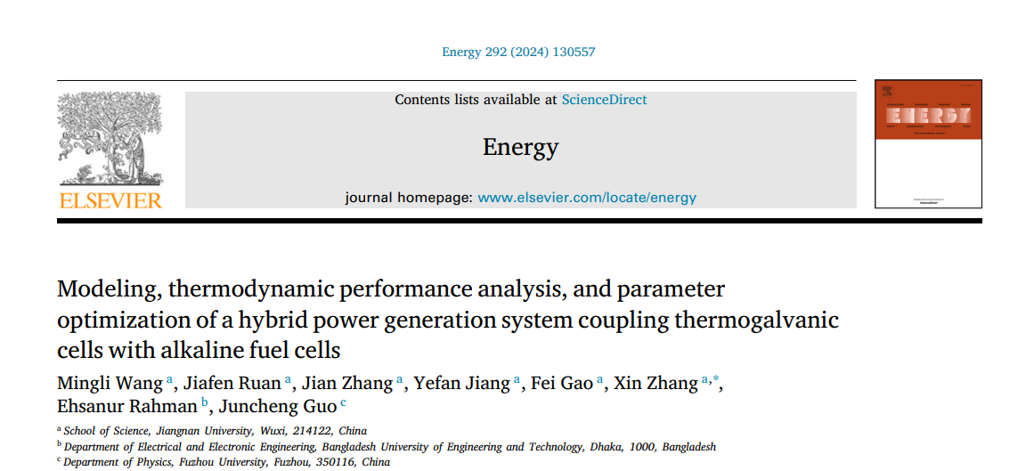 近日,理学院光电信息科学与工程系21级本科生国家级大创团队在低温燃料电池的废热回收利用与热电联产方面取得重要研究进展,研究成果以题为“Modeling, thermodynamic performance analysis, and parameter optimization of a hybrid power generation system coupling thermogalvanic cells with alkaline fuel cells”发表在热力学领域顶级期刊《Energy》(中科院一区Top期刊,影响因子:8.4)。