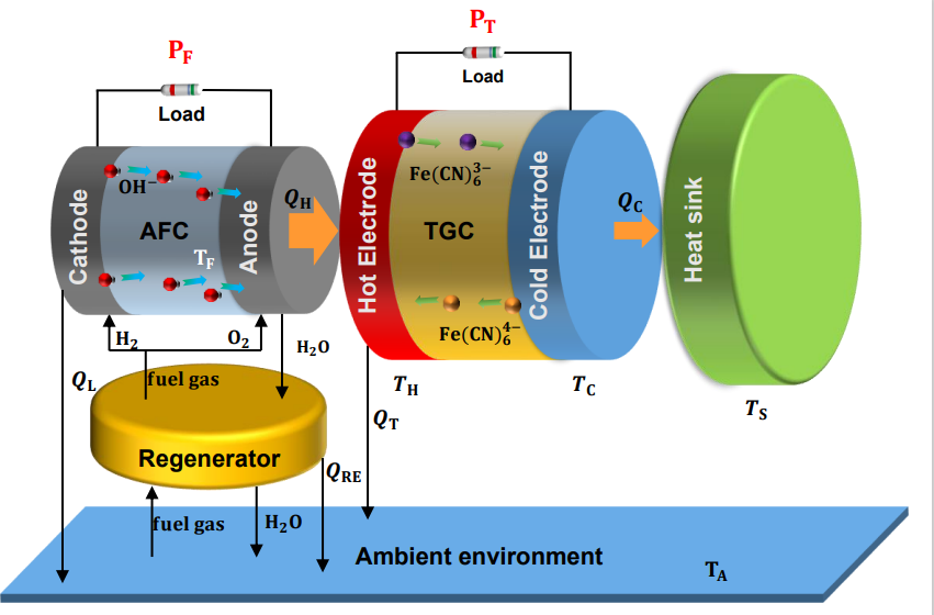 碱性燃料电池(简称AFC)在运行过程中会产生大量的废热,造成环境污染和温室效应。为了回收AFC产生的低品位废热,该团队提出了一种技术上可行的方法,即通过液态热电池(简称TGC)与AFC集成,用于热电联产和高效废热回收。该工作为AFC-TGC混合系统的优化设计和参数分析提供了重要的理论指导,从而为开发基于AFC的高性能热电联产系统铺平了道路。