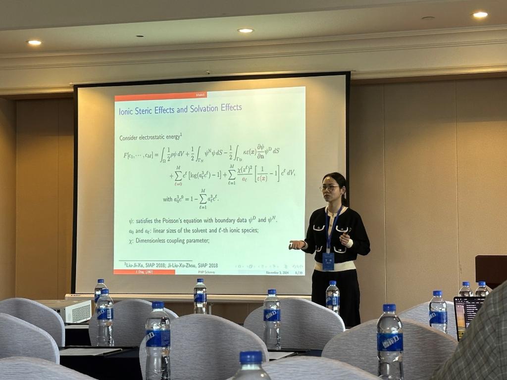 经学院、江苏省数学会层层推荐,丁洁博士获邀在计算数学分会上作了题为“Structure-preserving discretization for the Poisson-Nernst-Planck equations”的报告,详细介绍了Poisson-Nernst-Planck方程的应用背景和保结构的数值离散化方法,引起与会专家热烈讨论。会议期间,两位老师与其他高校的同行们进行了充分的学习和交流,为推进一步提高我校数学学科的知名度起到了积极的推动作用。