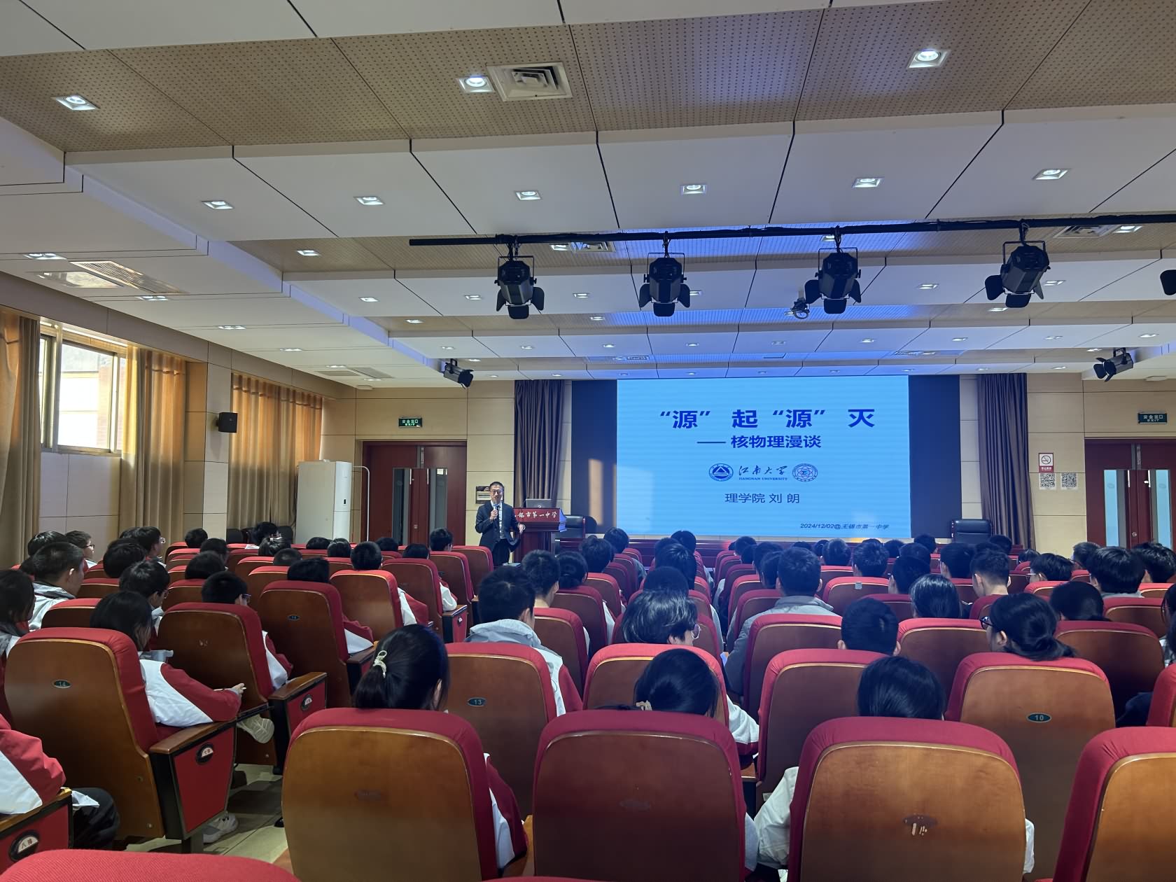 12月2日,理学院副院长刘朗教授来到无锡市第一中学,为无锡一中学子作了题为《“源”起“源”灭——核物理漫谈》的科普讲座。无锡一中学子200余人参加了活动。