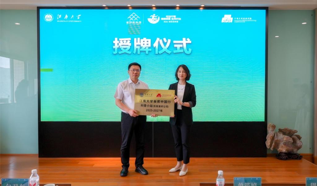活动现场,单筱婷向苏南食材公司颁授“江南大学食育中国行科普小站”铭牌,标志着校企合作迈入新阶段。随后,包卫东、孙国宏及学校职能部门领导嘉宾共同登台开启倒计时,宣告食品学院2025年全民营养周活动正式启动。