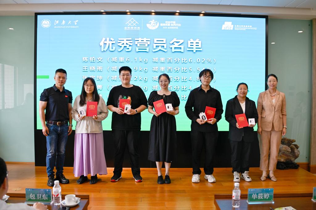 结营仪式上,全场师生通过观看视频回顾训练营精彩瞬间。经过21天科学体重管理指导,20名同学顺利结营并取得良好成效。结营表彰环节,周伟涛、汪超、叶军分别为营员代表颁发结营证书,秦永和、傅莉莉为优秀营员颁发证书和奖品。外国语学院王晓雨同学作为代表分享训练营期间的体验和收获。随后,谢云飞介绍科学体重管理方案,分享由食品学院陆乃彦教授团队设计的7天减重食谱,介绍并倡议师生参与中国营养学会“21天健康生活打卡”活动,鼓励全体师生一起“吃动平衡”,收获“健康体重”。