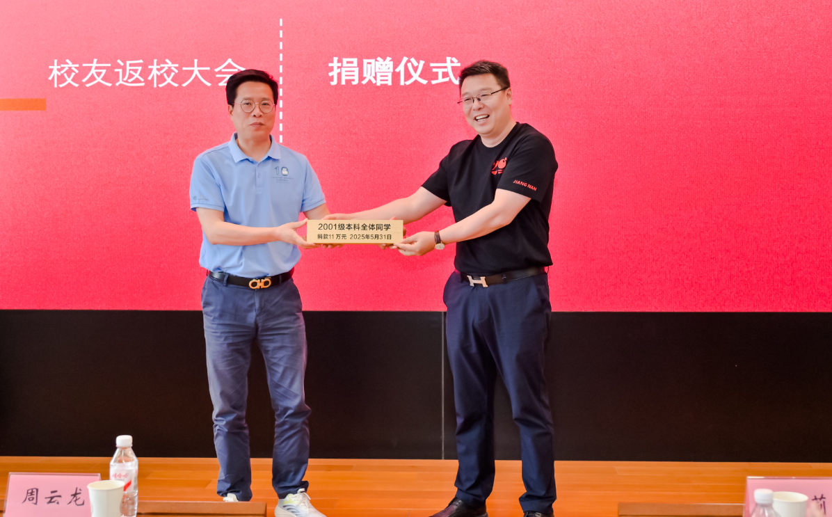 大会最后,江南大学校友会秘书长、社会合作与校友联络处处长周云龙与校友代表共同登台,完成捐赠环节。食品学院2021级本科校友以赤诚之心感恩母校培养,为学院未来发展注入温暖力量。