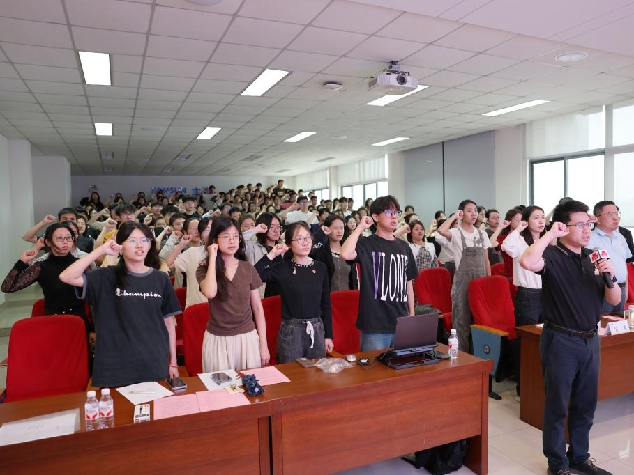 在食品学院D912报告厅主会场与D917分会场,300余名毕业生党员、新发展党员在学工办主任兼分团委书记李金杰的带领下庄严宣誓。铿锵誓言回荡会场,党员们眼神中闪烁着信仰的光芒。本科生第一党支部曾美怡作为新党员代表发言时表示,这是对政治生命的郑重宣告,更是对“为人民服务”宗旨的永恒承诺。熟悉的字句唤醒入党初心。“当右手握拳过肩时,实验室里‘求真务实’的精神与党旗下的誓言交叠,我更加明确了作为江南食品人的使命担当。”食硕2203党支部孟逸云作为毕业生党员代表发言如是说。