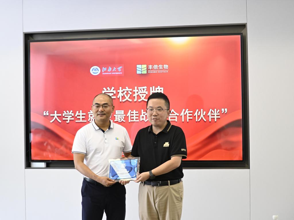 平原、李雷等为荣获第二届苏州丰倍“三全育人”奖学金的本硕博学生代表颁发荣誉证书,并合影留念。李雷向苏州丰倍颁授“江南大学大学生就业最佳战略合作伙伴”铭牌。