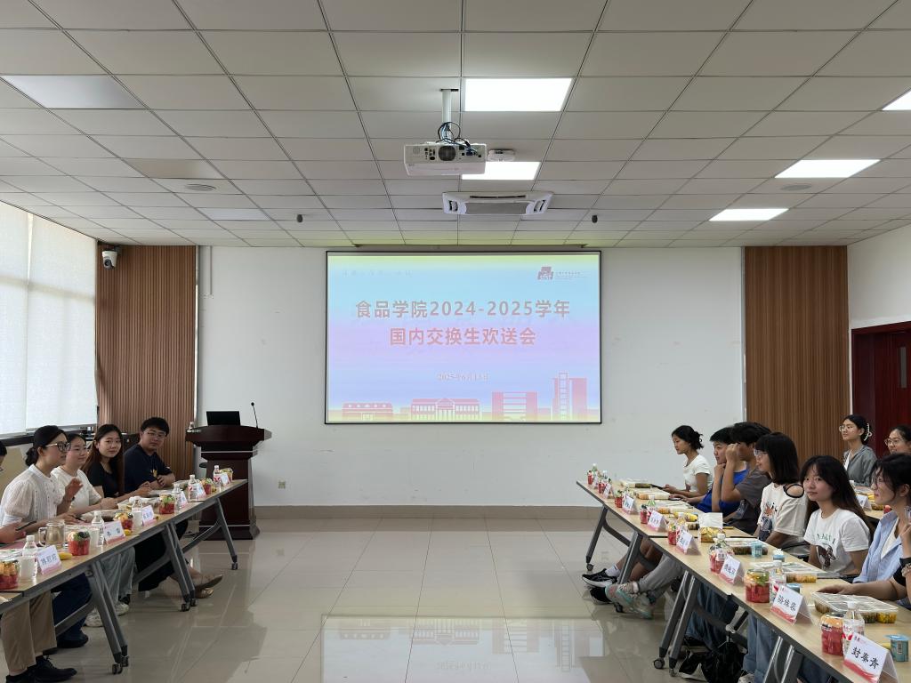 6月13日,食品学院2024-2025学年国内交换生欢送会在D916会议室举办。学院党委副书记兼副院长李雷、2022级本科生辅导员张任、2023级本科生辅导员崔家玮及来自茅台学院、山西师范大学、石河子大学、新疆农业大学、台湾实践大学的29名交换生参加活动。座谈会由崔家玮主持。