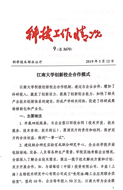 近日,《科技工作情况》在2019年第9期刊发了题为“江南大学创新校企合作模式”的案例报道。
