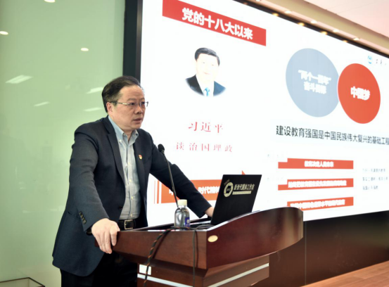 朱庆葆围绕“深刻领会总书记关于高等教育的重要论述”和“以习近平总书记关于高等教育的重要论述指引学校前进方向”两个层面进行生动领学和辅导。首先,他带领师生党员回顾梳理了习近平总书记关于高等教育的重要论述,阐述了习近平新时代中国特色社会主义思想与其关于教育尤其是高等教育的重要论述之间的逻辑递进关系。他指出,习近平总书记关于高等教育的重要论述高屋建瓴、博大精深,我们必须要站在历史与现实、中国与世界、教育与人才成长的战略高度,紧紧抓住“学校办学、学生培养、教师队伍”三个关键方面,牢牢把握新时代高等教育指导思想“因时而进”的价值结构与特征,深刻把握立德树人、优先发展、人民中心、中国特色的理论实质和精神内涵。