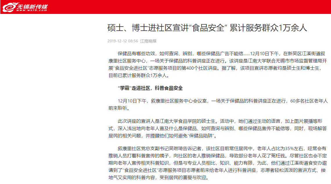12月12日,江南晚报以《硕士、博士进社区宣讲“食品安全”累计服务群众1万余人》为题,对该项目的具体开展情况和引起的社会反响进行了报道。文中介绍,该项目自2012年创立以来,来自食品学院的400余名硕、博士研究生已走进全市近400个社区、58所小学,完成广场志愿服务7次,累计服务群众1万余人。志愿者的身影穿梭于无锡的各个行政区,真正践行了“惠及民生、造福百姓”的誓言与初心。