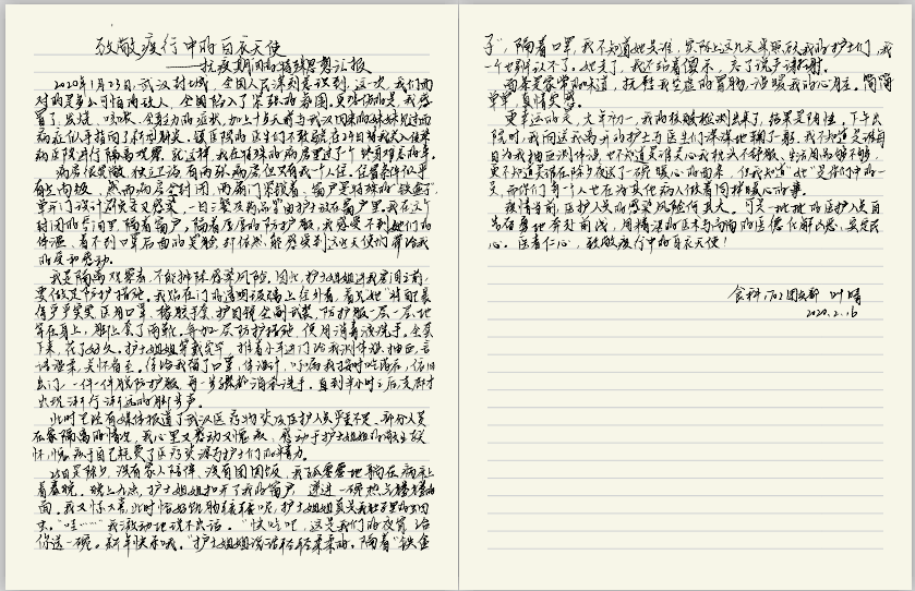 食科1707班叶晴在结束有惊无险的医院隔离后,她写道“下午出院时,我向送我离开的护士与医生们深深地鞠了一躬,我不知道是谁每日为我抽血测体温,也不知道是谁关心我枕头不舒服、生活用品够不够,更不知道是谁在除夕夜送了一碗暖心好面条,但我知道她是你们中的一员,而你们每一个人也在为其他病人了做着同样暖心的事。”