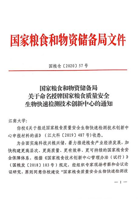 近日,国家粮食和物资储备局发布了《国家粮食和物资储备局关于命名授牌国家粮食质量安全生物快速检测技术创新中心的通知》。根据相关规定,经组织专家现场考察和会议论证研究,原则同意我校建设“国家粮食质量安全生物快速检测技术创新中心”,并授予牌匾。