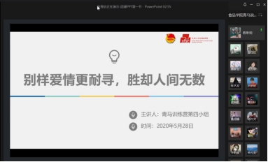 2020年5月29日,食品学院第十二届青马训练营第四小组线上举行了以“别样爱情更耐寻,胜却人间无数”为主题的“团支书说团课——‘青马’特辑”活动。