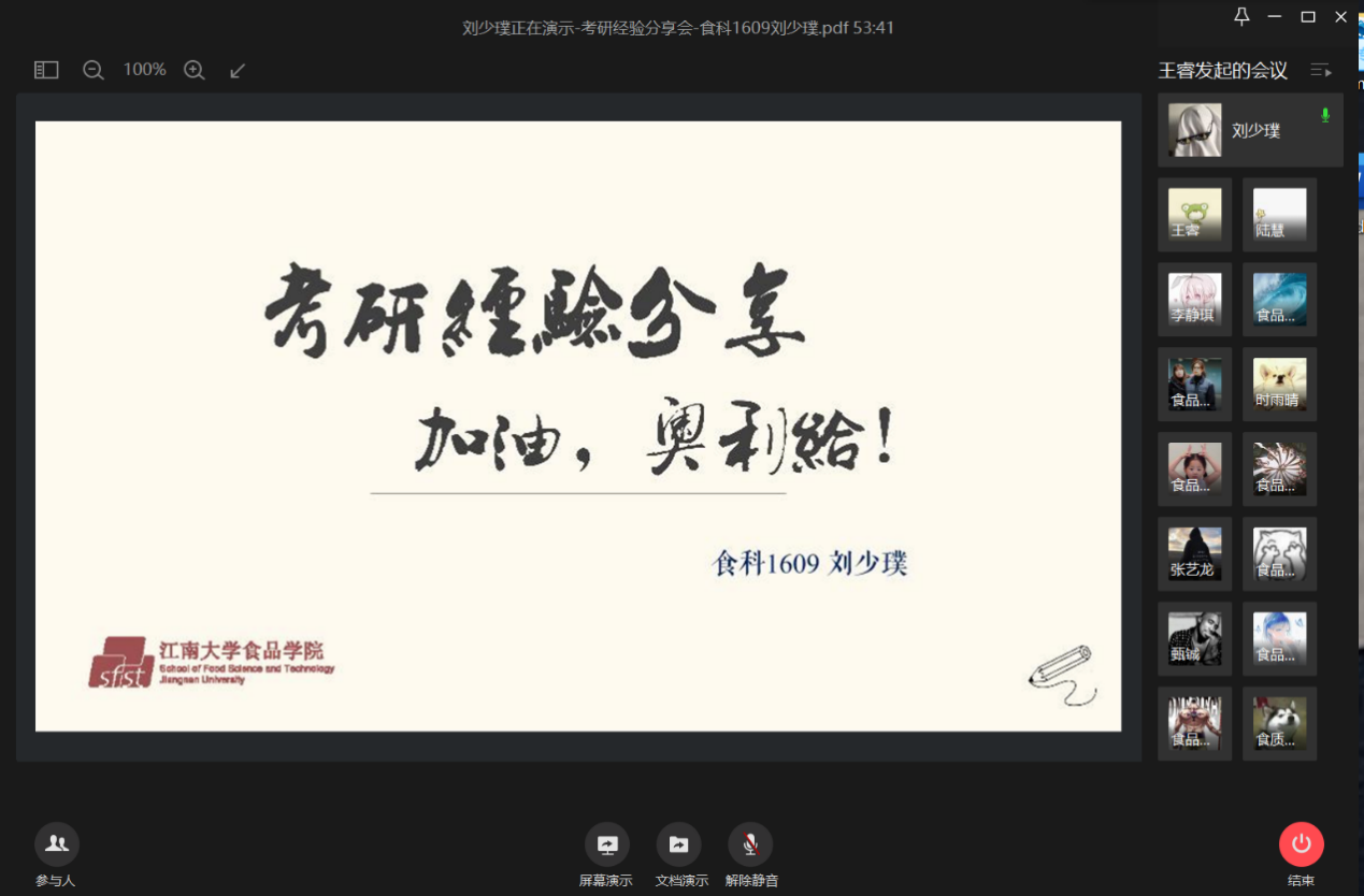 为增强2021届学生考研信心,为备考学生提供复习指导建议,6月7日晚,食品学院开展了线上考研经验分享会,孙孟琦、瞿佳丽、袁志良等6位2020届优秀考研学子在会上分享考研成功经验,300余名备考学生参与聆听。