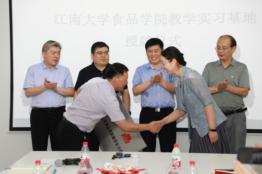 仪式最后,傅莉莉为刘忠思授牌“江南大学食品学院教学科研基地”。李景超、效国强、何志莹等共同见证授牌。