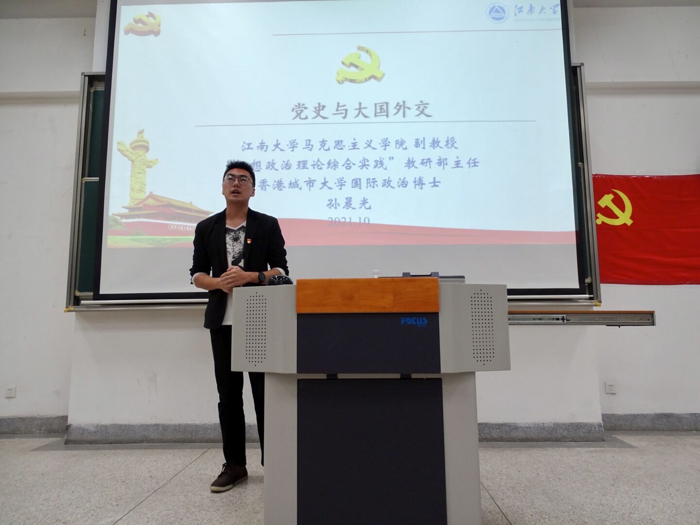 随后,孙晨光给新生党员讲授了第一节党课《党史和大国外交》。他围绕加强应对疫情之策、中国外交发展简史、中国重返联合国50周年纪念活动三个方面进行了阐述,带领同学们回顾了中国的外交历程。他呼吁大家理智面对疫情,相信国家、相信党的领导。