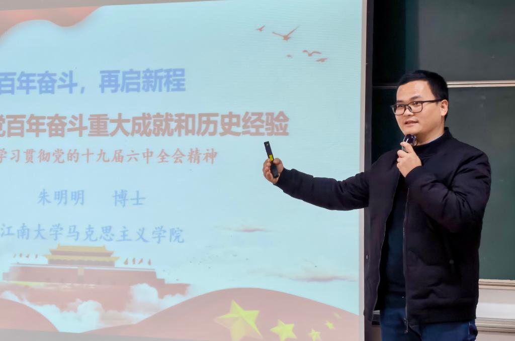 朱明明老师通过丰富的历史资料和事例,回顾了党的百年奋斗重大成就和历史经验。他围绕“一个根本问题”“两个确立”“三个重大”“四个伟大”“五大历史意义”“十个坚持”等内容深入浅出地阐述了党的十九届六中全会的精神实质和核心要义,诠释了“中国共产党为什么能”的深层逻辑和胜利密码,引导同学们学党史、听党话、感恩党,跟党走,从党的百年光辉历程中汲取营养,明晰新征程的奋进方向。朱老师指出,作为入党积极分子,要认真学习和吸收党的十九届六中全会精神,准确把握党的历史发展主题主线,不忘初心,切实做到以史为鉴、开创未来,走好实现第二个百年奋斗目标的新的赶考之路,在新时代新征程上展现新气象新作为。
