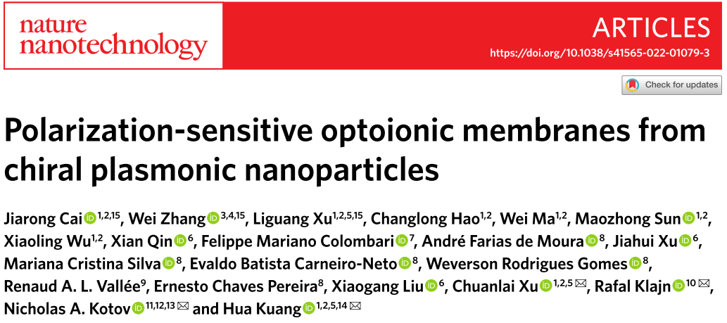 江南大学胥传来教授团队受螳螂虾启发,利用金纳米颗粒自组装排列形成手性纳米膜,实现了圆偏振光的精准区分与识别,研究工作以Polarization-sensitive optoionic membranes from chiral plasmonic nanoparticles为题,于3月14日在《自然·纳米技术》(Nature Nanotechnology)期刊上在线发表(https://www.nature.com/articles/s41565-022-01079-3)。