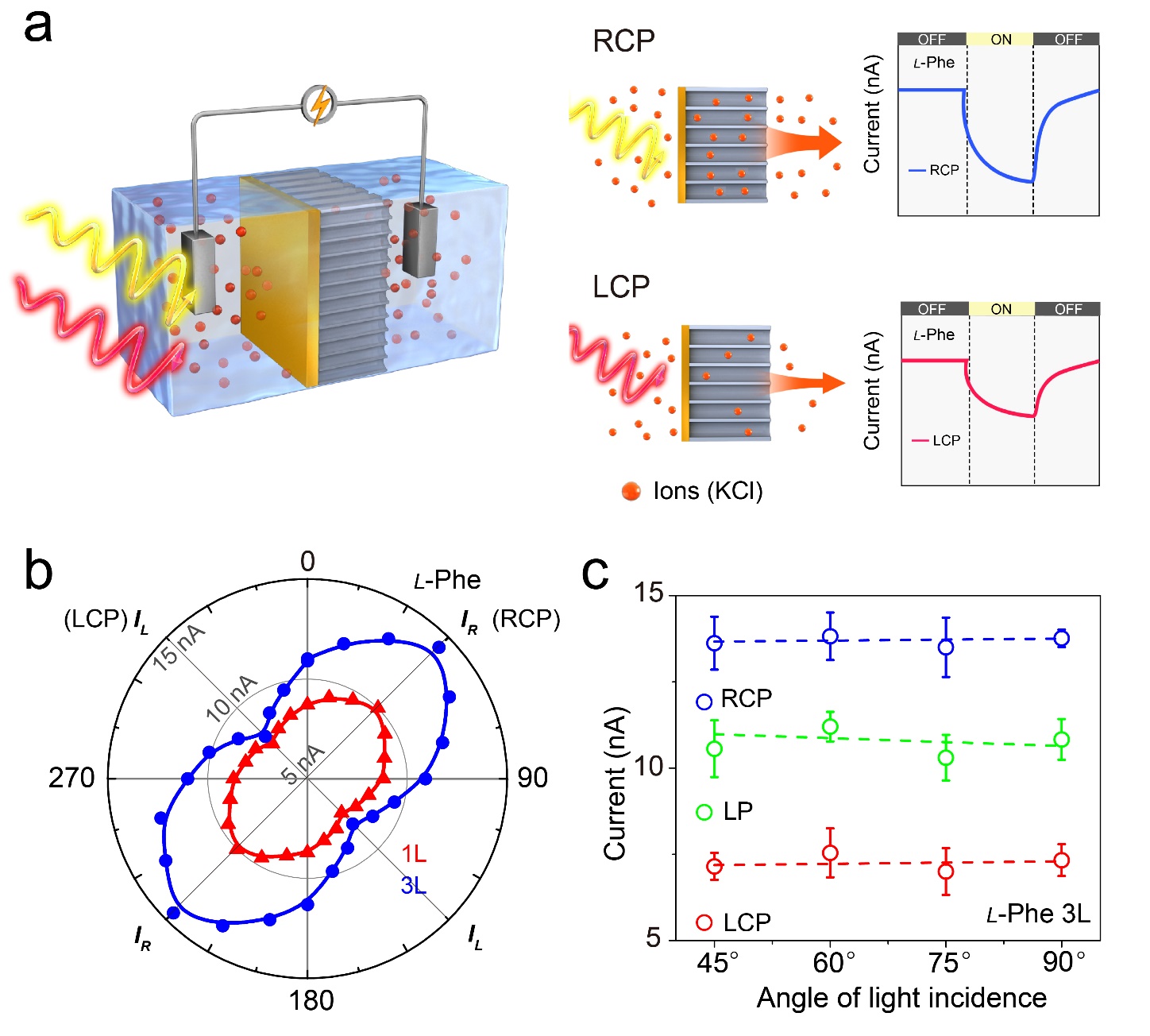 (a)手性光离子膜在CPL照射下的电化学测试装置及手性光离子膜的CPL识别示意图。(b)单层和三层l-Phe修饰的手性纳米薄膜光电流极化依赖性的极坐标图。(c)三层l-Phe修饰的纳米薄膜在不同入射角的CPL光照射下的电流统计。入射角指光与纳米薄膜表面之间的角度。