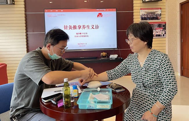 9月9日下午,院分工会组织的“针灸推拿养生义诊”活动在学院D905举办。此次义诊邀请到江南大学附属医院治未病科魏华麟中医师前来坐诊,为老师们提供包括针灸、推拿、拔罐体验和中医养生咨询。
