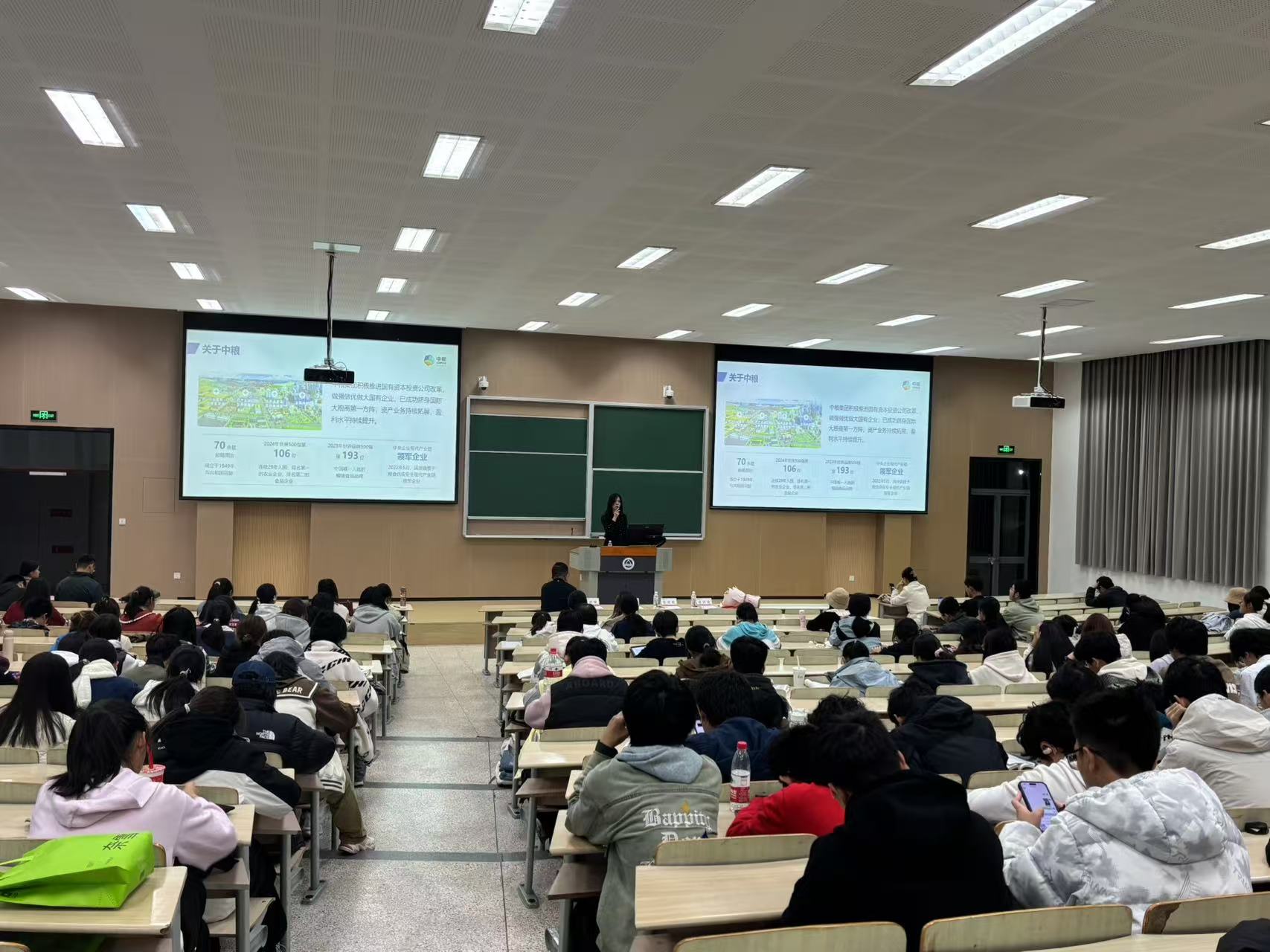 郭斐从粮食安全和粮油市场两方面予以讲解,综合多项企业调研数据,清晰量化展示粮食供给与需求,对“以我为主,立足国内,确保产能,适度进口,科技支撑”的二十字国家粮食安全战略进行深入剖析。她详细阐述主粮和油脂的消费市场,通过国内外具体案例道出粮油的发展趋势和创新方向,带领同学们对行业加深了认知与感受,对未来的从业方向充满期待。