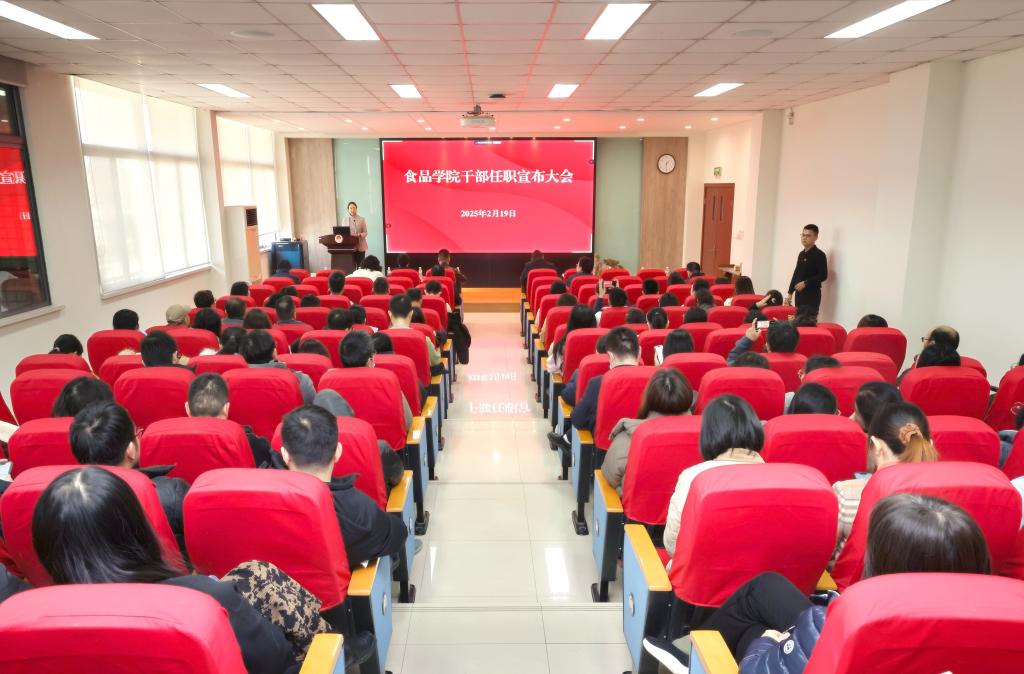 2月19日,食品学院干部任职宣布大会在学院D912报告厅召开。校党委书记吴正国,校党委常委、组织部部长张梁,学院领导班子与全体教职员工出席会议。食品学院党委书记傅莉莉主持会议。
