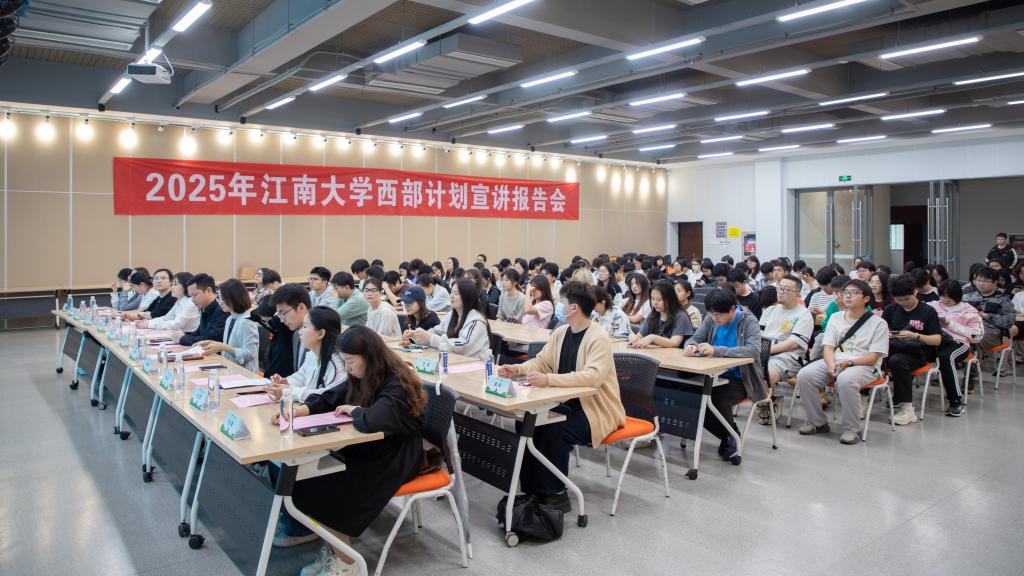 4月21日下午,2025年江南大学西部计划宣讲报告会(第五场),在北区大学生活动中心F105报告厅举行。共青团无锡市滨湖区委员会副书记肖江,江南大学党委学生工作部副部长单云婷,商学院党委副书记、副院长孙小芳,江南大学团委组织部部长王牧,商学院分团委书记兼学工办主任王璁,2025届毕业生辅导员孙旭媛、吴松等出席活动。学校150余名应届毕业生及在读研究生共同参加活动。本场活动由商学院研究生会王楠歌主持。