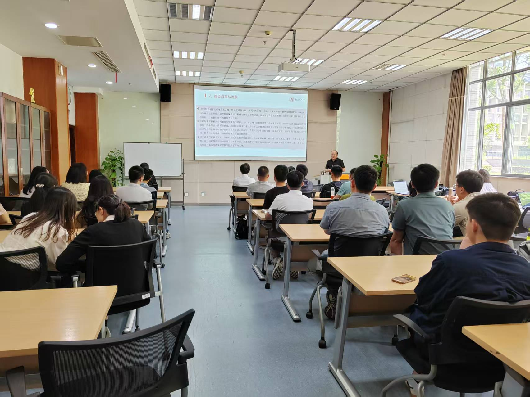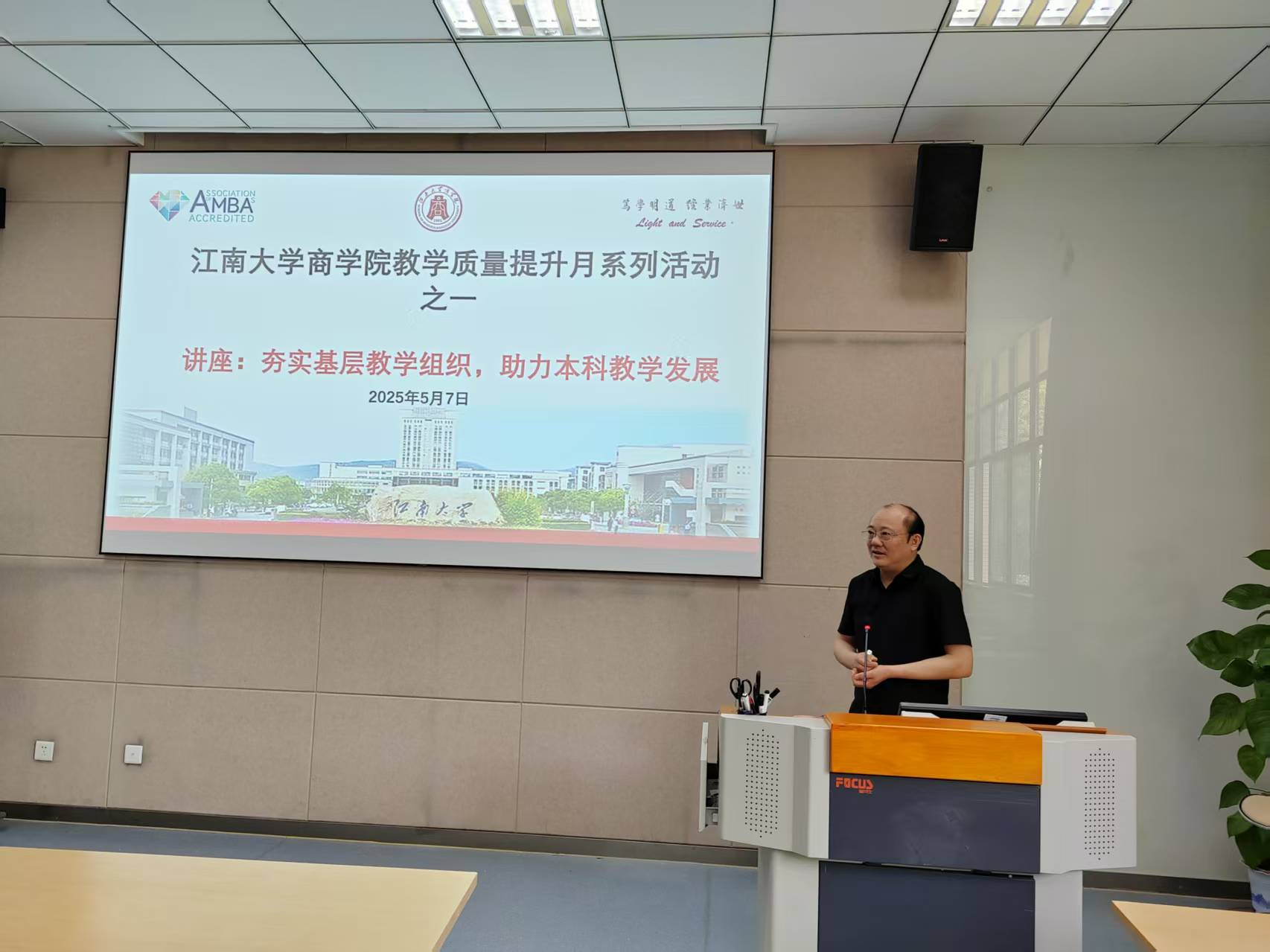 5月7日下午,商学院“教学质量提升月”首场活动,在学院119会议室举办。商学院徐海俊副教授以“夯实基层教学组织,助力本科教学发展”为主题作专题报告。学院各系教师共计50余人参会。活动聚焦本科基层教学组织建设,旨在通过经验分享与互动交流,推动教学团队协同创新,为学院本科教育高质量发展注入新动能。
