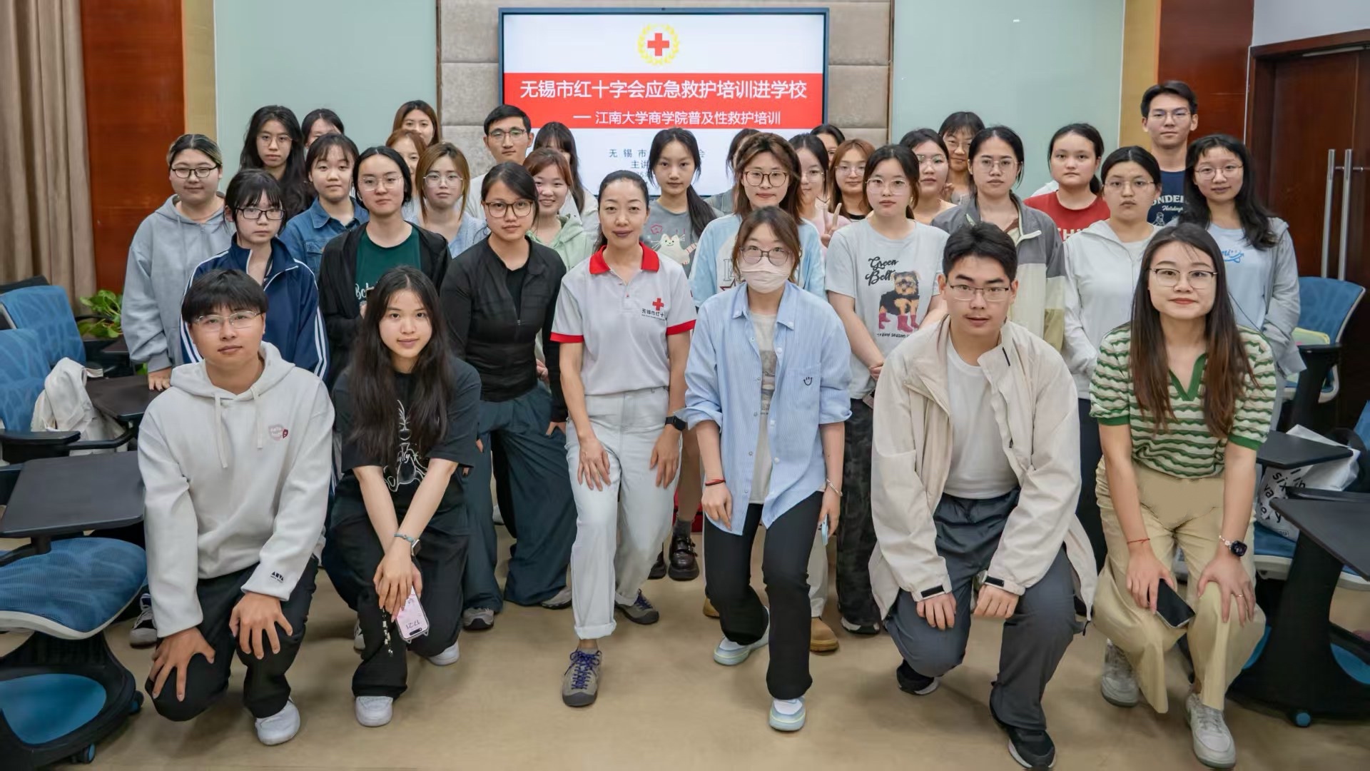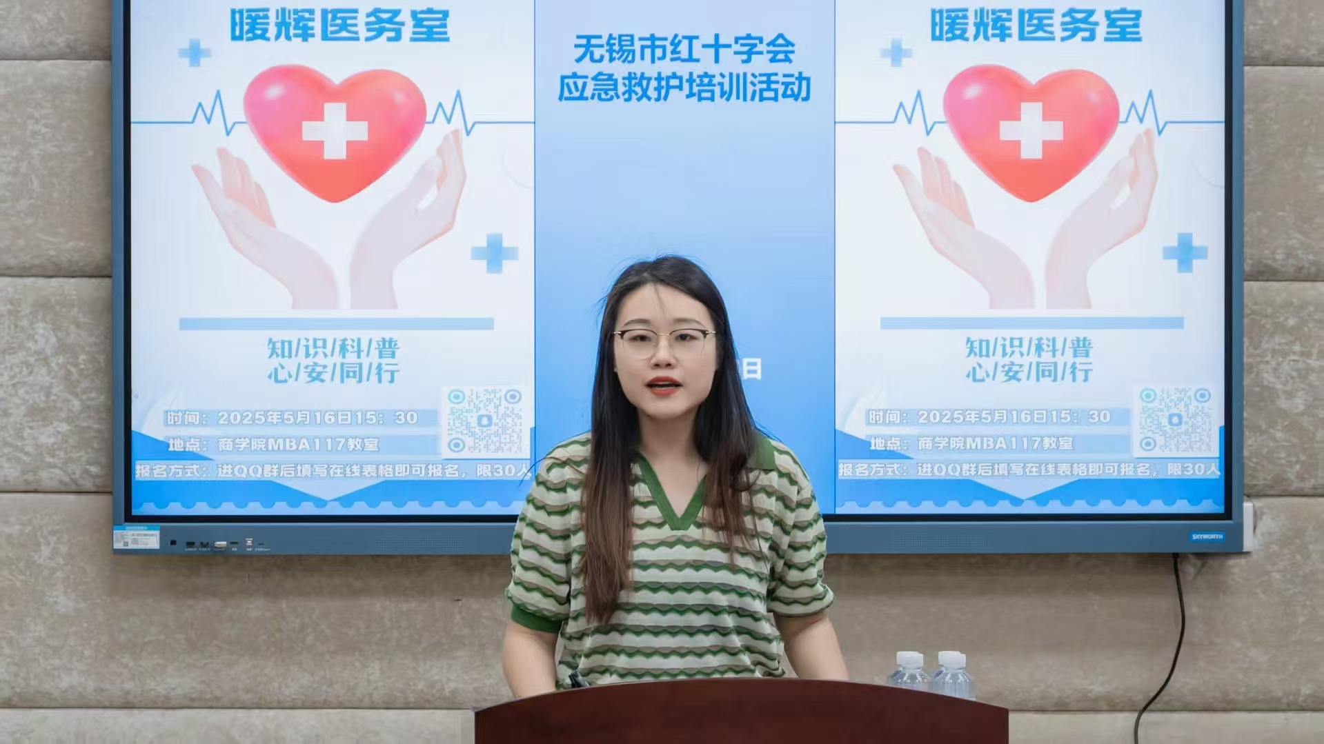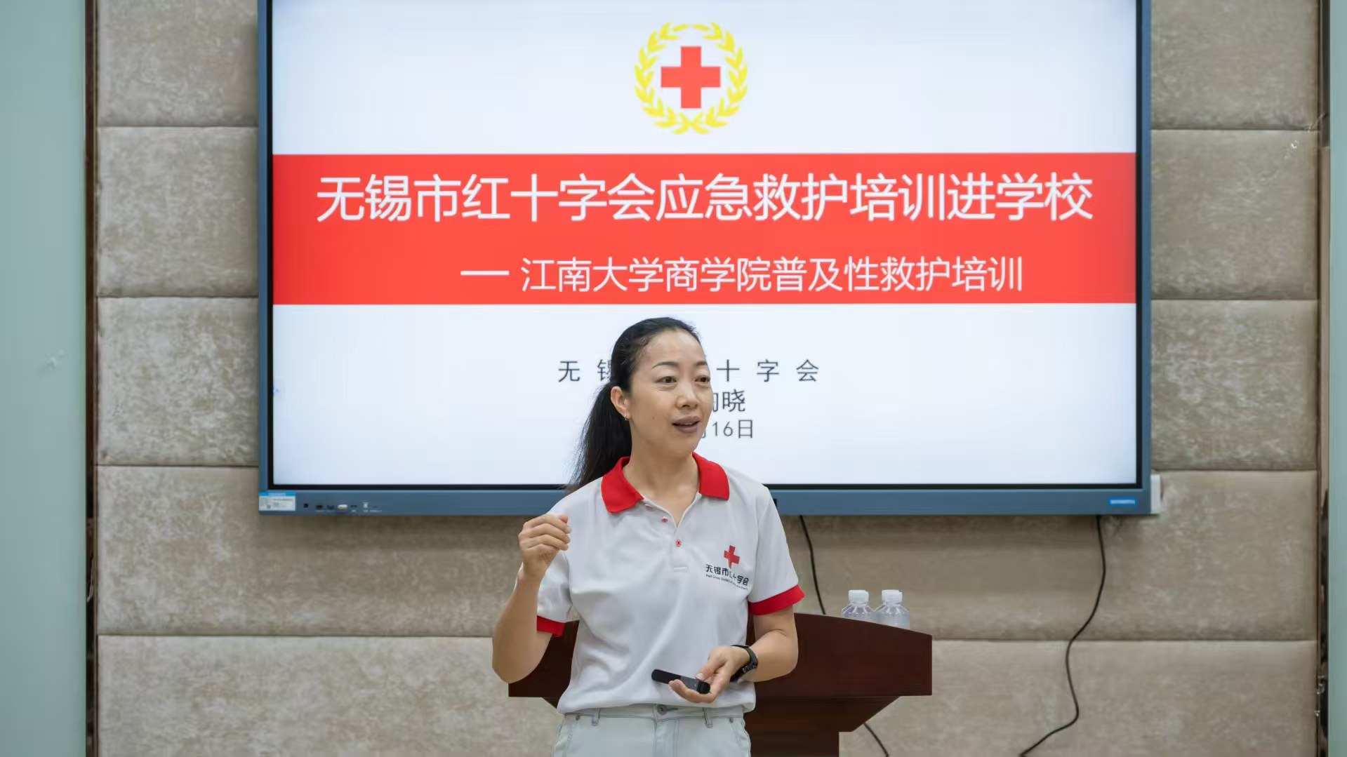 5月16日下午,江南大学商学院联合无锡市红十字会,在学院117教室举办“应急救护培训进校园——暖辉医务室”专题活动。活动邀请无锡市红十字会专业老师陶晓作专题培训,30名商学院学生参加系统理论教学和实操演练。活动由商学院心理工作辅导员田雨主持。