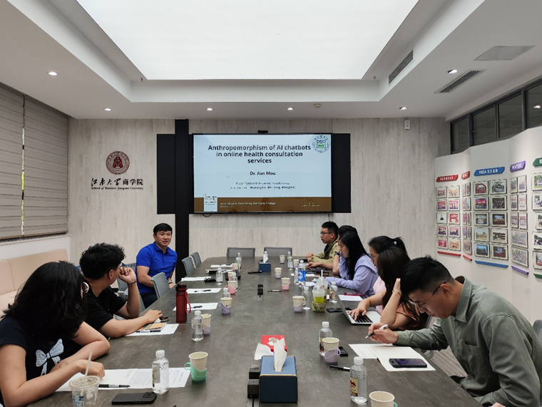 近日,数智组织与智融创新研究团队第三期学术活动在商学院109会议室举行。韩国釜山大学商学院牟健教授受邀作题为《人工智能聊天机器人的拟人化对用户持续使用在线健康咨询服务的影响关系研究》的要闻。本次讲座由商学院组织管理系主任汪长玉教授主持,学院教师和各专业研究生共计20余人参加讲座。