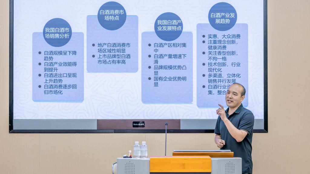江南大学商学院副院长刘勇以《桂酒产业发展战略研究》为题,系统分析了我国和广西白酒产业的发展现状与趋势以及存在的突出问题,给出培育龙头企业、打造特色产区、深化产学研合作、实施科技创新、加强品牌建设等对策建议。同时,刘勇教授以《桂酒产业发展战略研究》案例,讲述高校教师如何做好资政报告,展示高校科研成果服务地方产业发展的模式和路径。